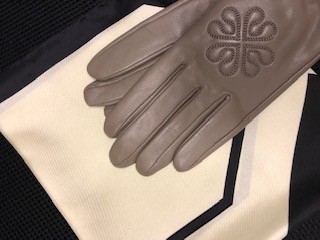 Beautiful black/white silk scarf and a pair of leather gloves. Size: small.