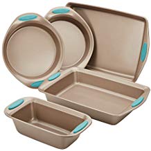 Rachel Ray quality bakeware includes: two (2) 9" round cake pans, one (1) loaf pan, one (1) 9" Square pan, one (1) 9 x 13 cake pan, one (1) 10 x 15 sheet pan. Rachael Ray Top 30 and 365-No Repeats cookbooks.